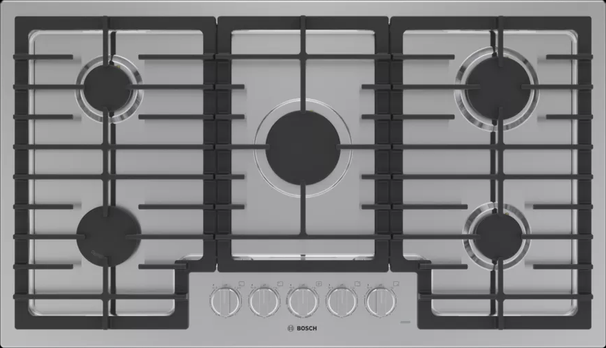 The Bosch 500® Series 36" stainless steel gas cooktop with continuous cast iron grates and OptiSim® burner. The seamless one-piece stainless steel design makes clean-up simple while the low profile design offers an integrated look.Read More