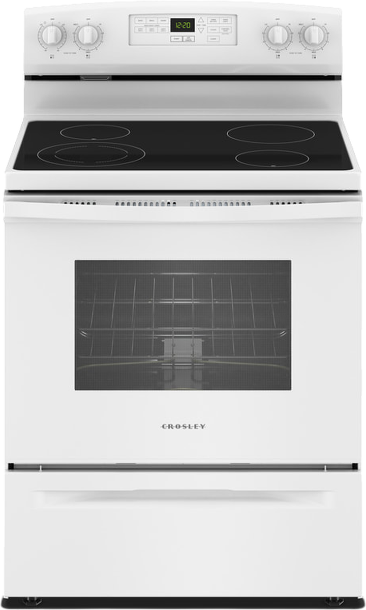 The Crosley® 30" White FreeStanding Electric Range has 4 - burners - 1 dual-size adjustable, removable full-width storage drawer, ceramic smoothtop design, and 4.8 cu. ft. oven capacityRead More