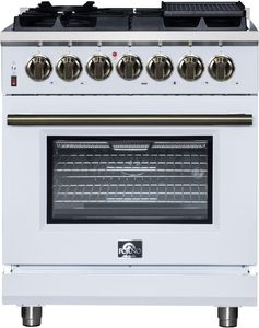 The Massimo 30 Inch Dual Fuel Range in White with Antique Brass Accessories blends professional performance with modern design. The cooktop features 4 powerful sealed gas burners and durable matte cast iron grates, along with a built-in wok ring and removable griddle for flexible cooking.Read More
