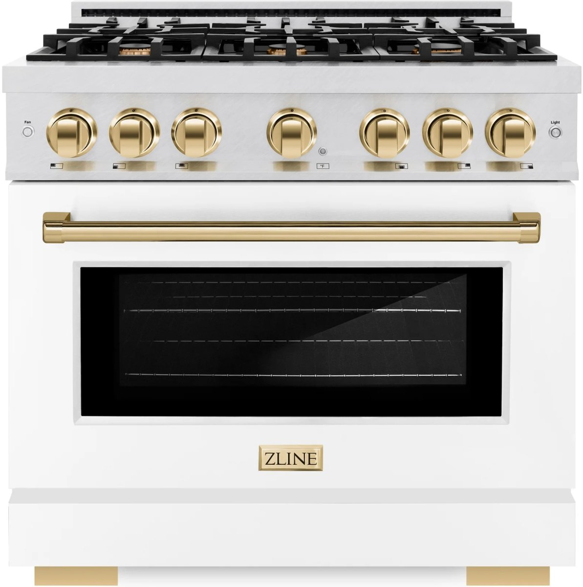 The ZLINE Autograph Edition 36 in. 5.2 cu. ft. Select Gas Range with 6 Burner Cooktop and Convection Gas Oven in Satin Stainless Steel with White Matte Door and Polished Gold Accents (HGRSZ-WM-36-G) combines the elegance of a hand-finished porcelain gas cooktop with 6 Italian-made auto-reignition burners, a gas convection oven with an energy-efficient cooling fan to ensure quiet operation, a beautiful white matte door with a Horizon window design, and stunning polished gold knobs and handle allowing you to master every meal.